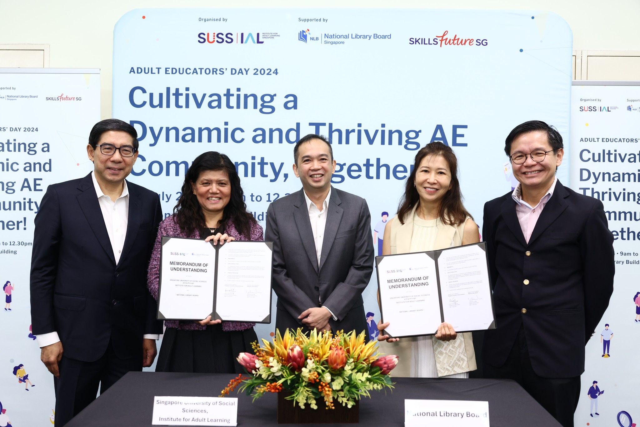 To support the TAE community, SUSS-IAL signed a Memorandum of Understanding (MOU) with the National Library Board to provide our educators with unparalleled access to a vast array of educational materials, workshops, and networking opportunities, equipping them with necessary resources to elevate their teaching standards and enhance the impact of their work delivery. The MOU also included joint development of relevant programmes and content, sharing of expertise, joint outreach programmes on adult learning opportunities and resources, and curation of activities such as workshops and talks.