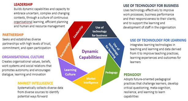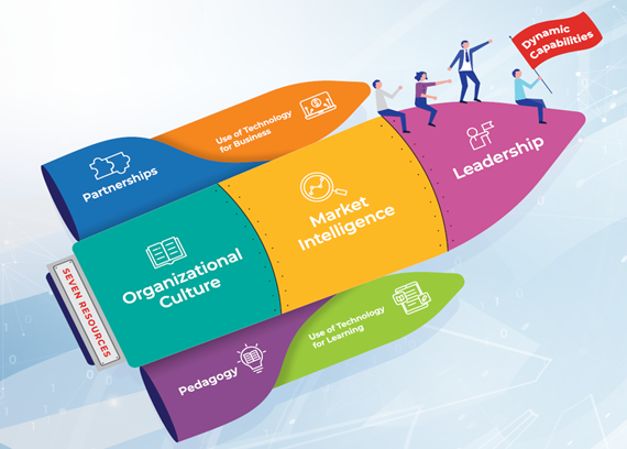 But what are these resources? Our research identified these as leadership, organisational culture, market intelligence, partnerships, pedagogy, technology for business and technology for learning. Figure 2 explains these seven resources core to dynamic capabilities.